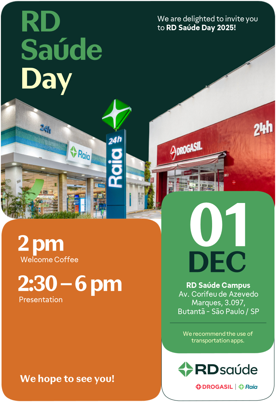 We are delighted to invite you to RD Saúde Day 2025, an event in which we will share the strategies that will guide the next phase of our business. Join us as we continue our journey to build a healthier society.